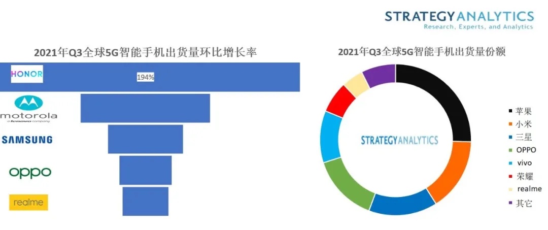 依据Strategy Analytics发布的最新研究报告,2021年Q3,小米5G智能手机出货量与上一季度相等。三星5G智能手机出货量比例持续增加。荣耀引领出货量增加。