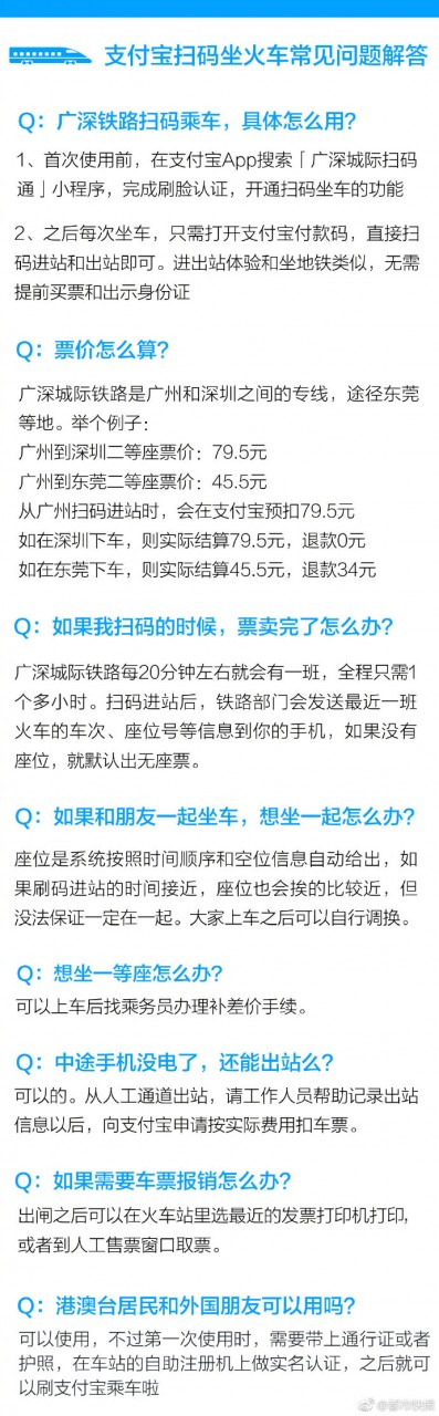也就是说,乘客忘掉带着身份证也没关系,而且不需要提早买票。扣费流程上,比方广州到深圳二等座 79.5 元,广州到东莞二等座 45.5 元,用户扫码过闸机时,将从支付宝预扣 79.5 元,假如用户在东莞下车,则会收到 34 元退款。