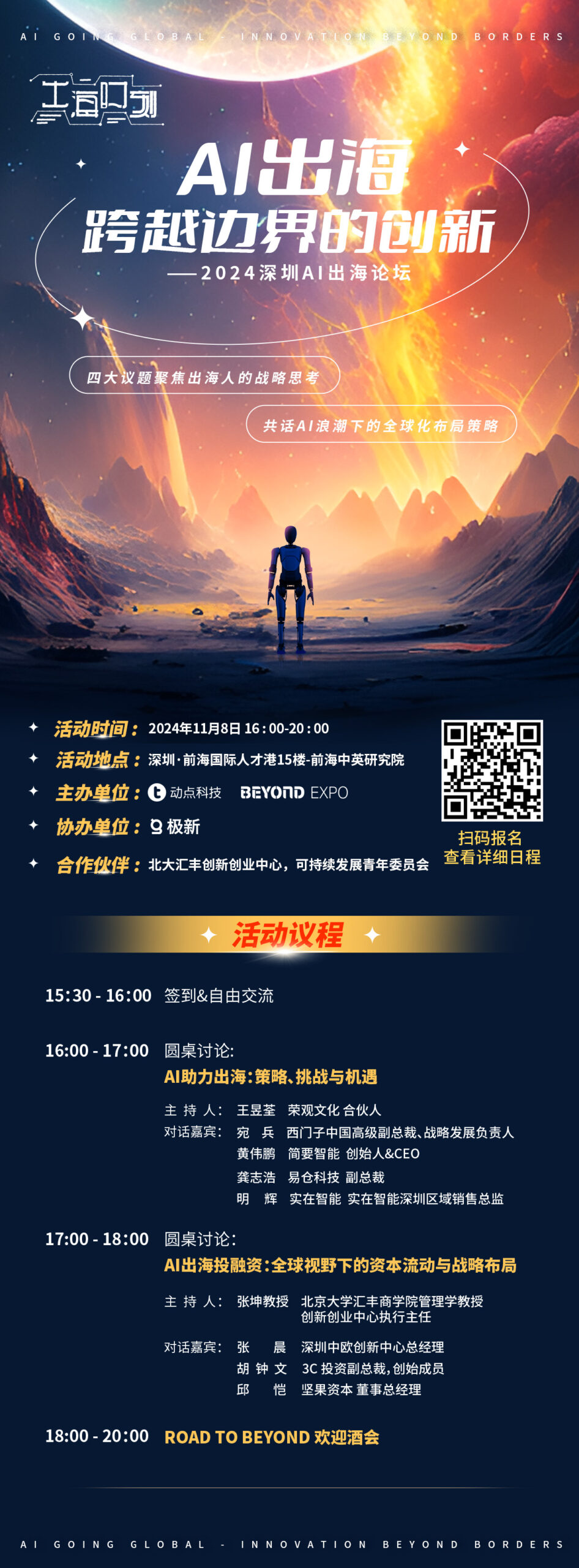 在阅历了2024 AI 出海系列论坛杭州站的火爆之后,2024深圳AI出海论坛【AI出海——跨过鸿沟的立异】鸣笛起航,即将在11月8日登陆深圳前海中英研究院,本次活动活动由动点科技和BEYOND Expo联合主办,极新协办,并得到前海中英研究院的鼎力支持。