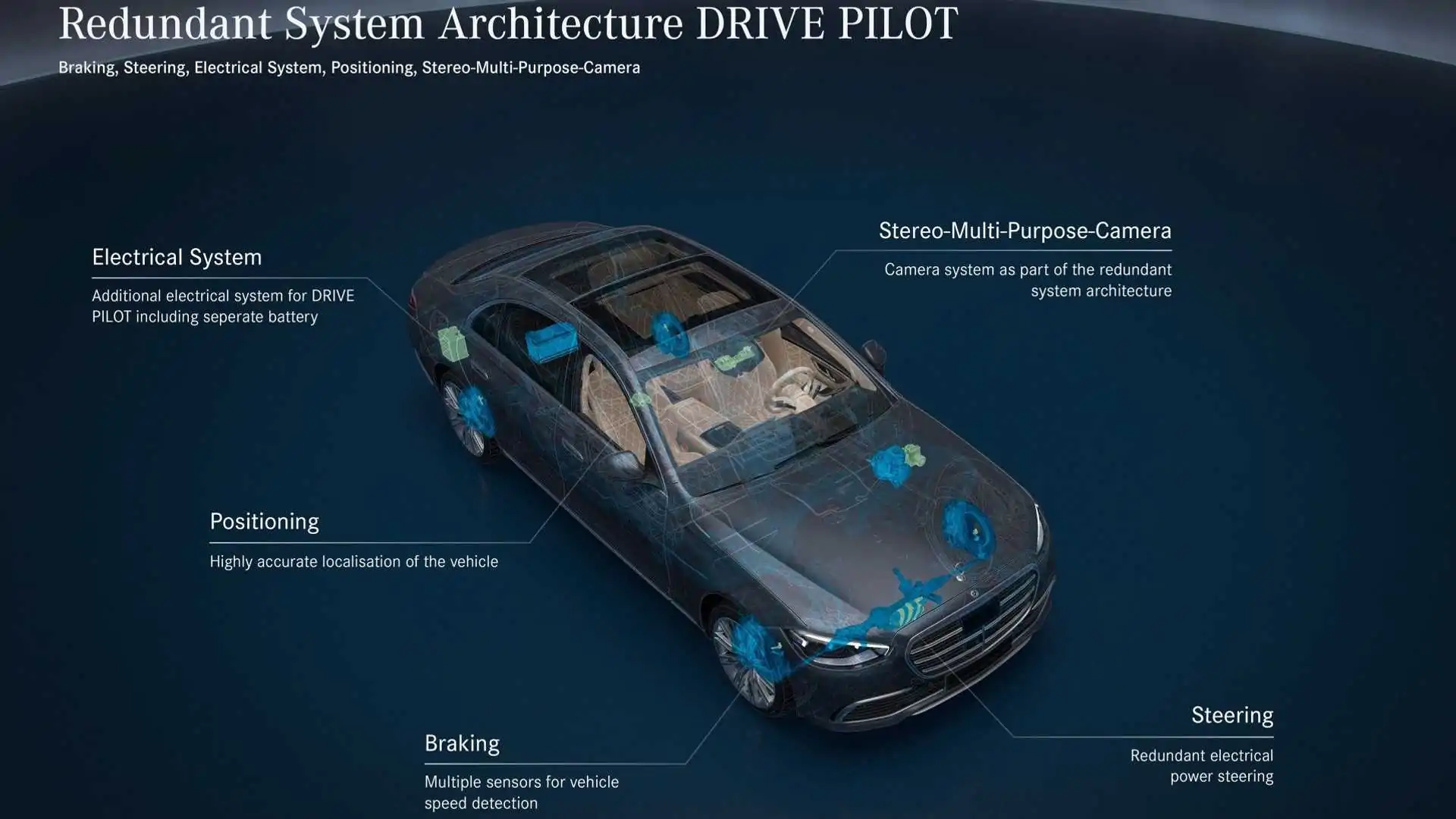 听说 Drive Pilot 会考虑路途概略、路途上产生的事情和交通标志等要素。梅赛德斯表明,它还可以对意外的交通状况做出反响并独立处理——例如,在车道内进行躲避操作或刹车。Drive Pilot 以驾驭辅佐包的盘绕传感器为根底,增加了梅赛德斯-奔驰以为安全有条件自动驾驭不可或缺的更多传感器。其间包含 LiDAR、后窗摄像头、用于检测紧迫车辆的麦克风以及轮舱中的路途湿度传感器。